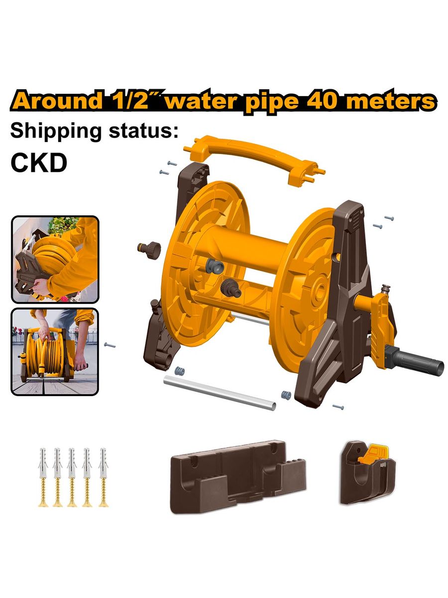 Катушка для шланга INGCO HHR40121 · Максимально можно обернуть вокруг водопроводной трубы 1/2. 40 метров. · Материал корпуса. ПП,Алюминий